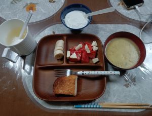 この日は昨日余ったクリームシチューを食べたが、時々スープの代わりに納豆を食べる